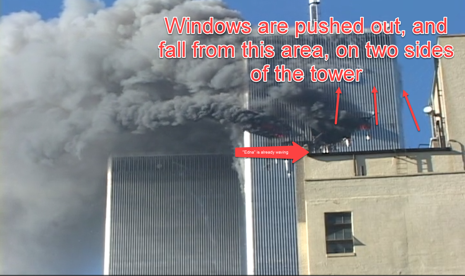 Recently, a viewer sent me this clip, outraged that I was “denigrating the memory of the dead.” They offered it as proof that the window‑people were still present at the moment of the collapse. But it isn’t proof of that at all. In fact, it shows the opposite: the window‑people were gone. See for yourself.